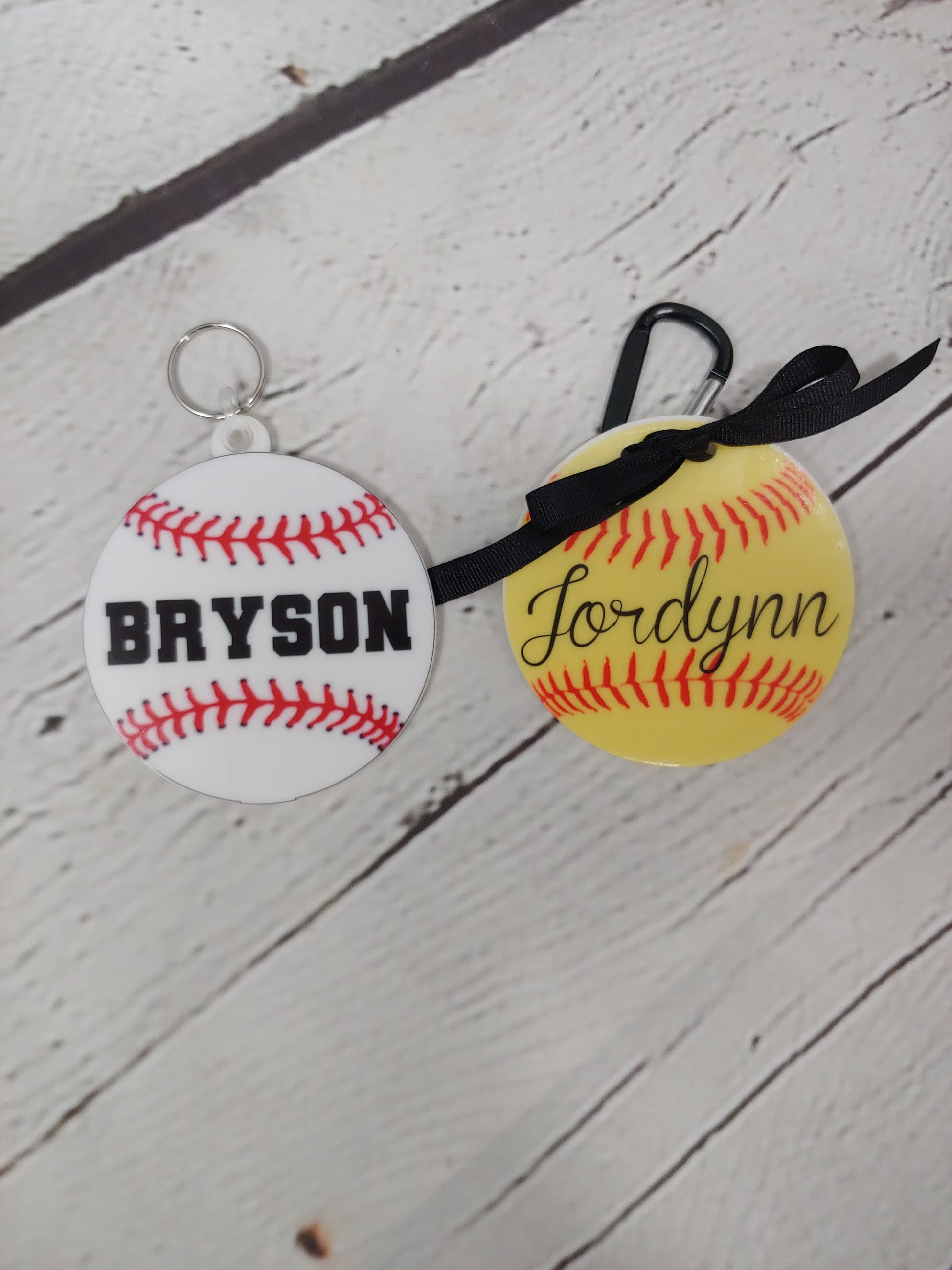Our softball and baseball tags are made from durable acrylic and customized with your child's name, team name, Baseball/Softball Mom, or saying of your choice. Hang them on your players bag for easy identification and style, or on your own personal bag you carry to the games! Choose from a Baseball or Softball theme, and your choice of hanger. Tags are 3.5" in diameter.